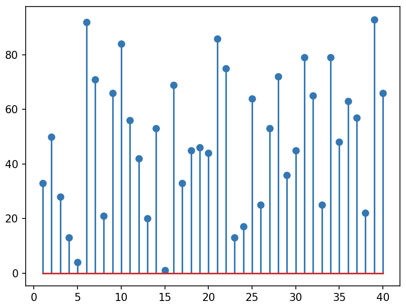 import matplotlib.pyplot as plt from random import randint data = [] for _ in range(1,41): data.append(randint(1,100)) plt.stem(range(1,41), data) plt.show()