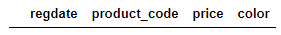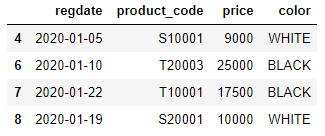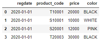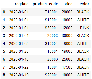 product = [['2020-01-01','T10001', 20000, 'BLACK'], ['2020-01-01','S10001', 10000, 'WHITE'], ['2020-01-01','S20001', 12000, 'PINK'], ['2020-01-01','T20003', 30000, 'BLACK'], ['2020-01-05','S10001', 9000, 'WHITE'], ['2020-01-20','T10001', 19000, 'BLACK'], ['2020-01-10','T20003', 25000, 'BLACK'], ['2020-01-22','T10001', 17500, 'BLACK'], ['2020-01-19','S20001', 10000, 'WHITE']] import pandas as pd df = pd.DataFrame(product, columns=['regdate','product_code','price', 'color']) df