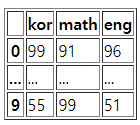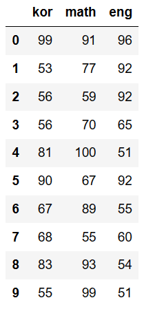 <table border="1" class="dataframe"> <thead> <tr style="text-align: right;"> <th></th> <th>kor</th> <th>math</th> <th>eng</th> </tr> </thead> <tbody> <tr> <th>0</th> <td>99</td> <td>91</td> <td>96</td> </tr> <tr> <th>1</th> <td>53</td> <td>77</td> <td>92</td> </tr> <tr> <th>2</th> <td>56</td> <td>59</td> <td>92</td> </tr> <tr> <th>3</th> <td>56</td> <td>70</td> <td>65</td> </tr> <tr> <th>4</th> <td>81</td> <td>100</td> <td>51</td> </tr> <tr> <th>5</th> <td>90</td> <td>67</td> <td>92</td> </tr> <tr> <th>6</th> <td>67</td> <td>89</td> <td>55</td> </tr> <tr> <th>7</th> <td>68</td> <td>55</td> <td>60</td> </tr> <tr> <th>8</th> <td>83</td> <td>93</td> <td>54</td> </tr> <tr> <th>9</th> <td>55</td> <td>99</td> <td>51</td> </tr> </tbody> </table>