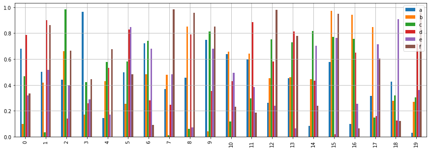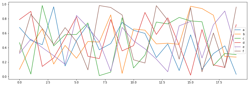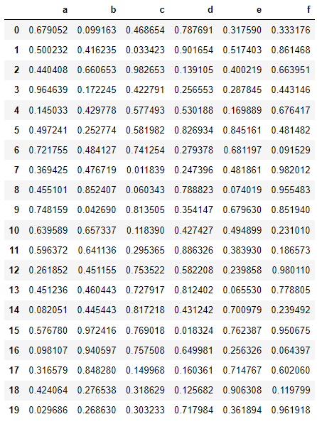 import numpy as np import pandas as pd df = pd.DataFrame(np.random.rand(20,6), columns=['a','b','c','d','e','f'])