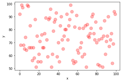 import numpy as np import pandas as pd x = [ x for x in range(100) ] y = [ randint(50,100) for x in range(100) ] df = pd.DataFrame(zip(x, y), columns=['x','y']) df.plot.scatter(x='x',y='y', s = 100, c = 'red', alpha=0.3)