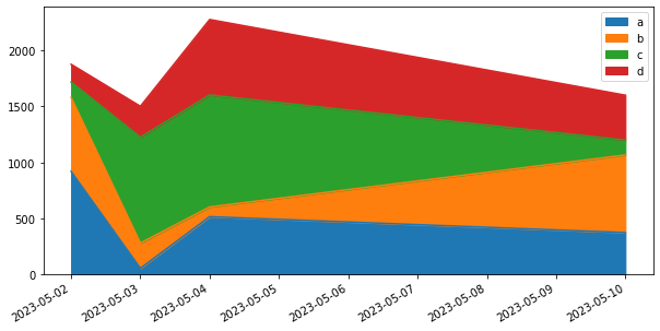 import numpy as np import pandas as pd from datetime import datetime from random import randint data = [[ randint(50,1000) for x in range(4) ] for x in range(4) ] ix = [ datetime(2023,5,randint(1,10)) for x in range(4) ] df = pd.DataFrame(data, columns=['a','b','c', 'd'], index=ix) df.plot.area(figsize=(10,5))