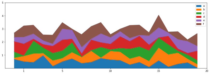 df.plot.area(figsize = (15,5), xticks = (1,5,10,15,20), yticks = (1,2,3,4,5))