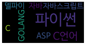 text = ''' 파이썬 파이썬 자바 파이썬 C언어 GOLANG 파이썬 ASP 자바스크립트 파이썬 C++ C언어 델파이 파이썬 ''' from wordcloud import WordCloud import matplotlib.pyplot as plt wordcloud = WordCloud(font_path='NanumBarunGothic.ttf', background_color='black').generate_from_text(text) plt.figure(figsize=(5,5)) plt.imshow(wordcloud, interpolation='bilinear') plt.axis('off') plt.show()
